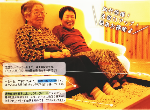 | 車いすのままでも足元からポカポカに。 施設様の新たな特色づくりに。 遠赤外線放射率の高いセラミックボールを使って足を温める温熱健康器具・指圧代用機です。 ![]() お湯を使った足湯と違い、面倒なお湯張りや、靴下を脱ぐ必要もありません。 15分程度温めれば、岩盤浴のように体中が温まり、出た後も2〜3時間ポカポカとした気持ち良さが続きます。 毎日のメンテナンスも不要なため、施設側(スタッフ)にもやさしい商品です。 【特徴】 ◆水を使わず湿気が無いため、水虫などの菌の増殖もなく衛生的です。 ◆セラミックボール一粒一粒から遠赤外線を放射し体中を温めるため、 岩盤浴のような効果・心地良さを楽しむことが出来ます。 ◆セラミックボールに適度な重みがあるため指圧効果を期待できます。 血行を良くし、筋肉のこりをほぐし、疲れを取ります。 ◆省エネ設計。1人用は35W/h、1日30円以下です。 1人用 35W 10時間使用で約9円 3人用 138W 10時間使用で約35円 5人用 207W 10時間使用で約52円 【使い方も色々】 ◆ リハビリ前のウォーミングアップに。 怪我の予防に役立ちます。 ◆ 遠赤外線セラミックボールの足つぼ効果で血流を良くし、筋肉の疲労をとる効果が期待できます。 ◆ 体温を上げることで免疫力の向上効果を期待できます。 お風呂に入らない日でも体がポカポカ。 車いすのままでも、靴下を履いたままでも。お手軽さが快適です。 販売価格(税込・送料込)